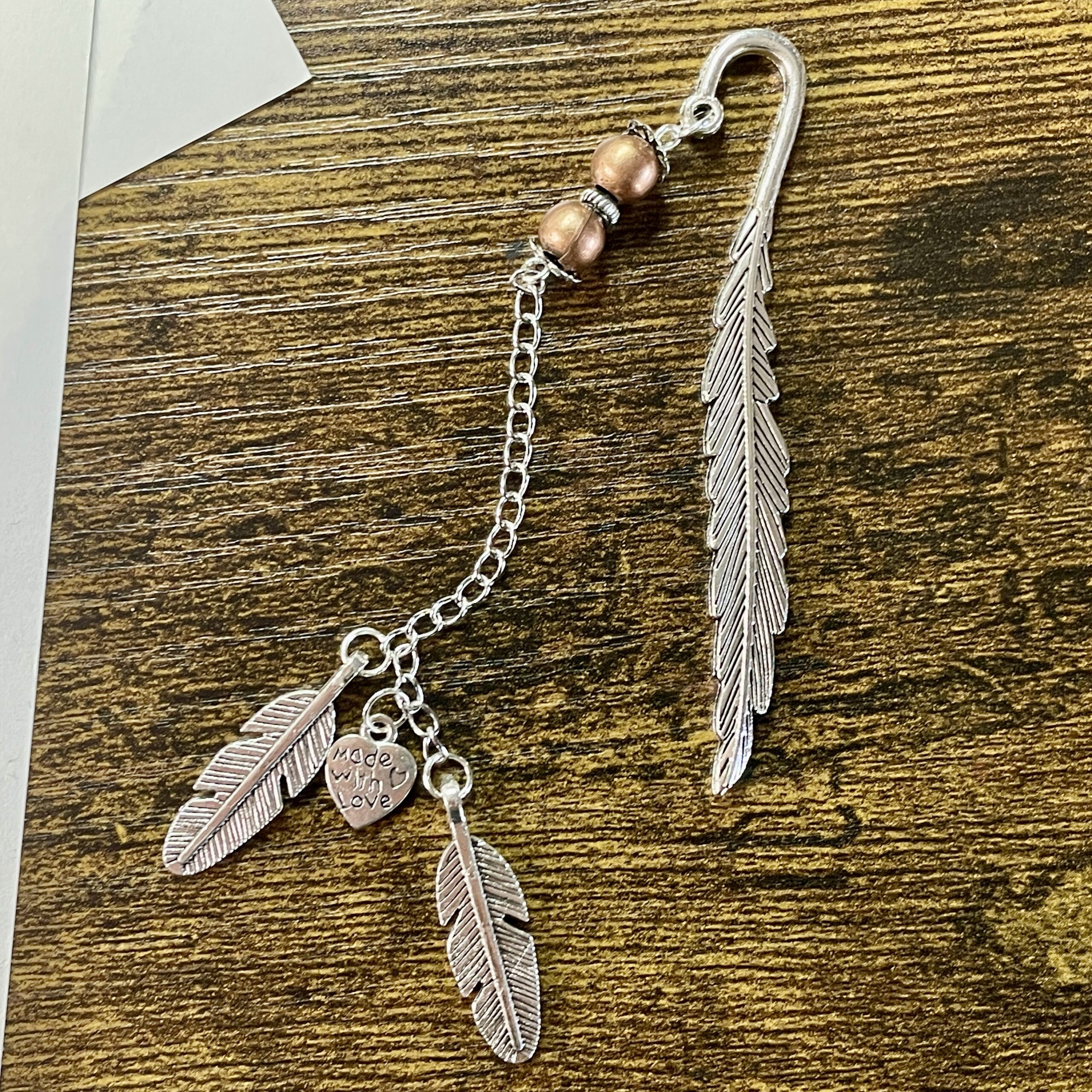 Elegant und doch stabil: Das silberfarbene Lesezeichen in Form einer geschwungenen Feder wurde für dich von Hand gefertigt. Mit den kupferfarbenen Perlen, den zwei kleinen Anhängern in Form einer Feder sowie einem silberfarbenen Herzchen an einer Kette passt es zu absolut jeder Lektüre.